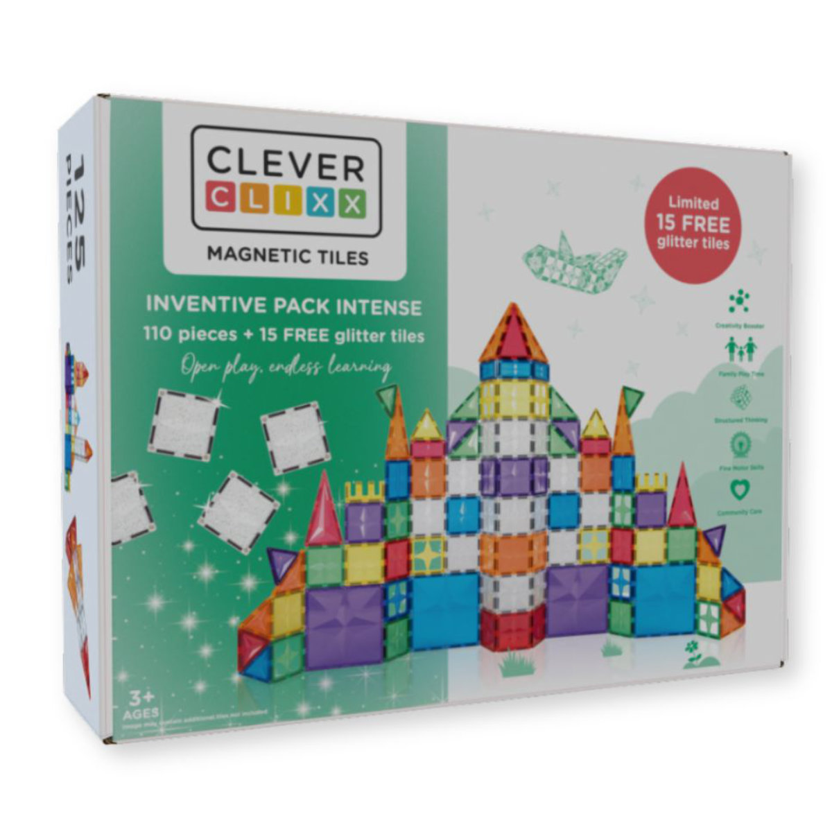 Feiere mit uns den 2. Geburtstag von Cleverclixx! Mit dem exklusiven Inventive Pack Intense erhältst du ein besonderes Set mit 110 magnetischen Fliesen in kräftigen Farben plus 15 GRATIS-Bonusfliesen – nur für kurze Zeit verfügbar. Mit diesem großen Set kannst du die spannendsten Bauwerke erschaffen: von hohen Türmen und Burgen bis hin zu bunten Fantasiewelten.
