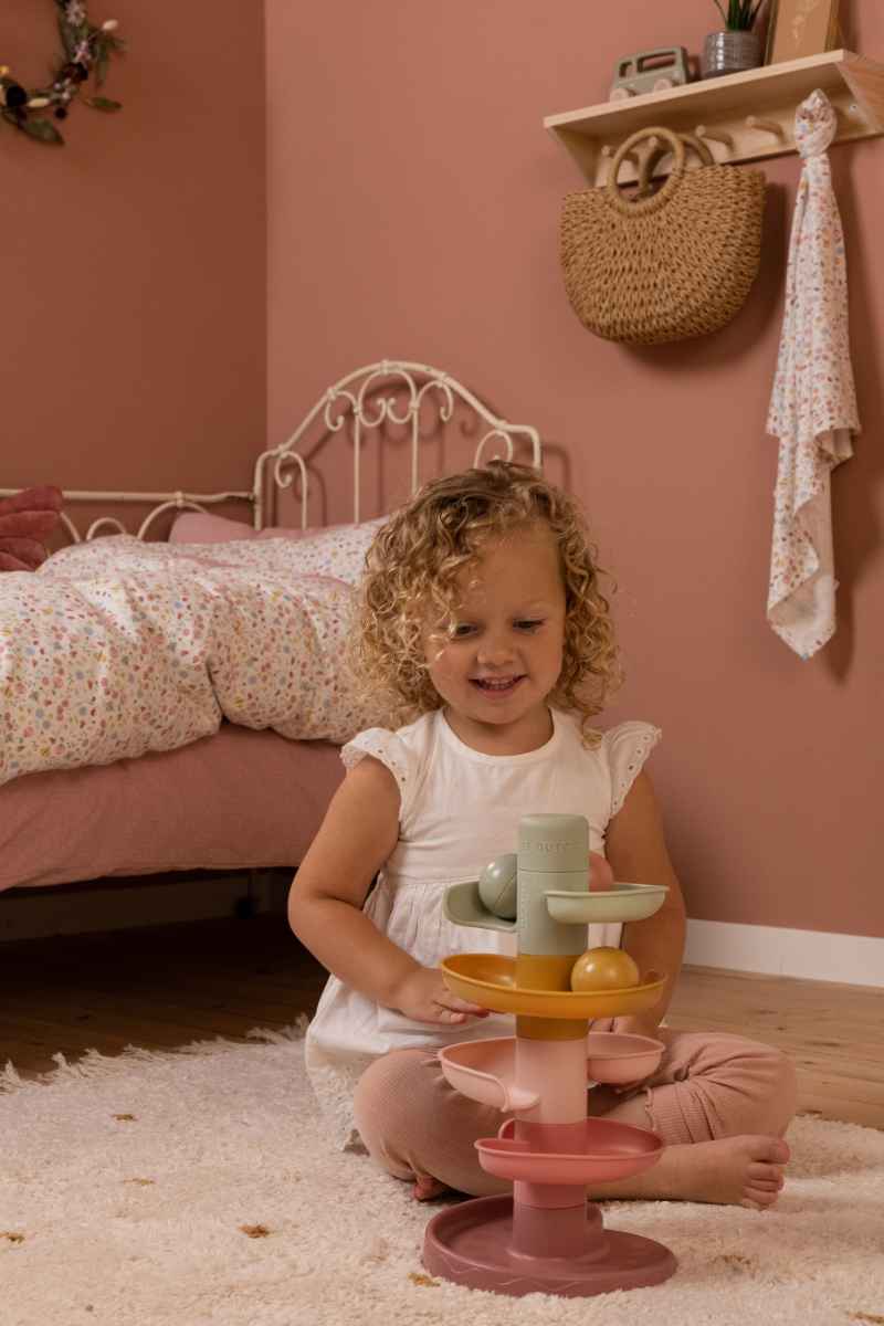 Let the ball roll down! A spiral tower that provides a lot of fun. The five colorful sets can be easily stacked on top of each other. Drop the balls one by one on the top level and watch them swing and roll one after the other. The game is an optimal helper in the development of hand-eye coordination. It teaches the child about cause and effect - a fun and educational game.The spiral tower comes standard with three light and grippy balls in different colors.