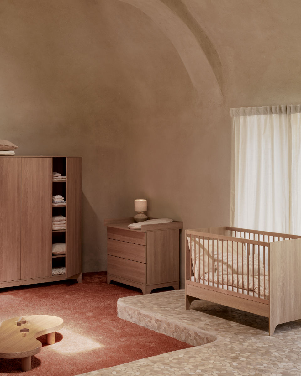 The Tsugi baby bed is available in 120 × 60 cm and 140 × 70 cm. Both models can later be converted into a cozy, semi-open toddler bed – perfect for relaxed play, reading, or resting.