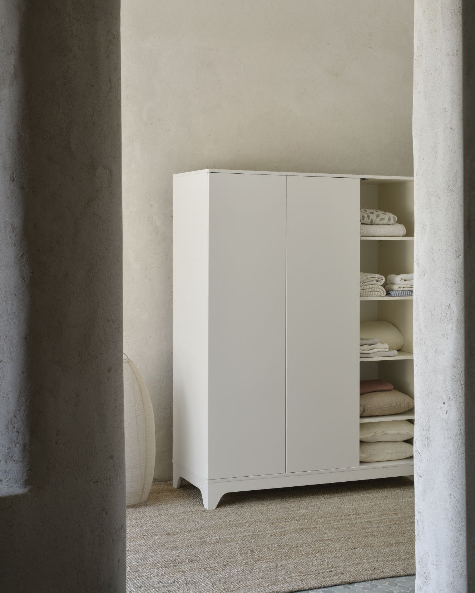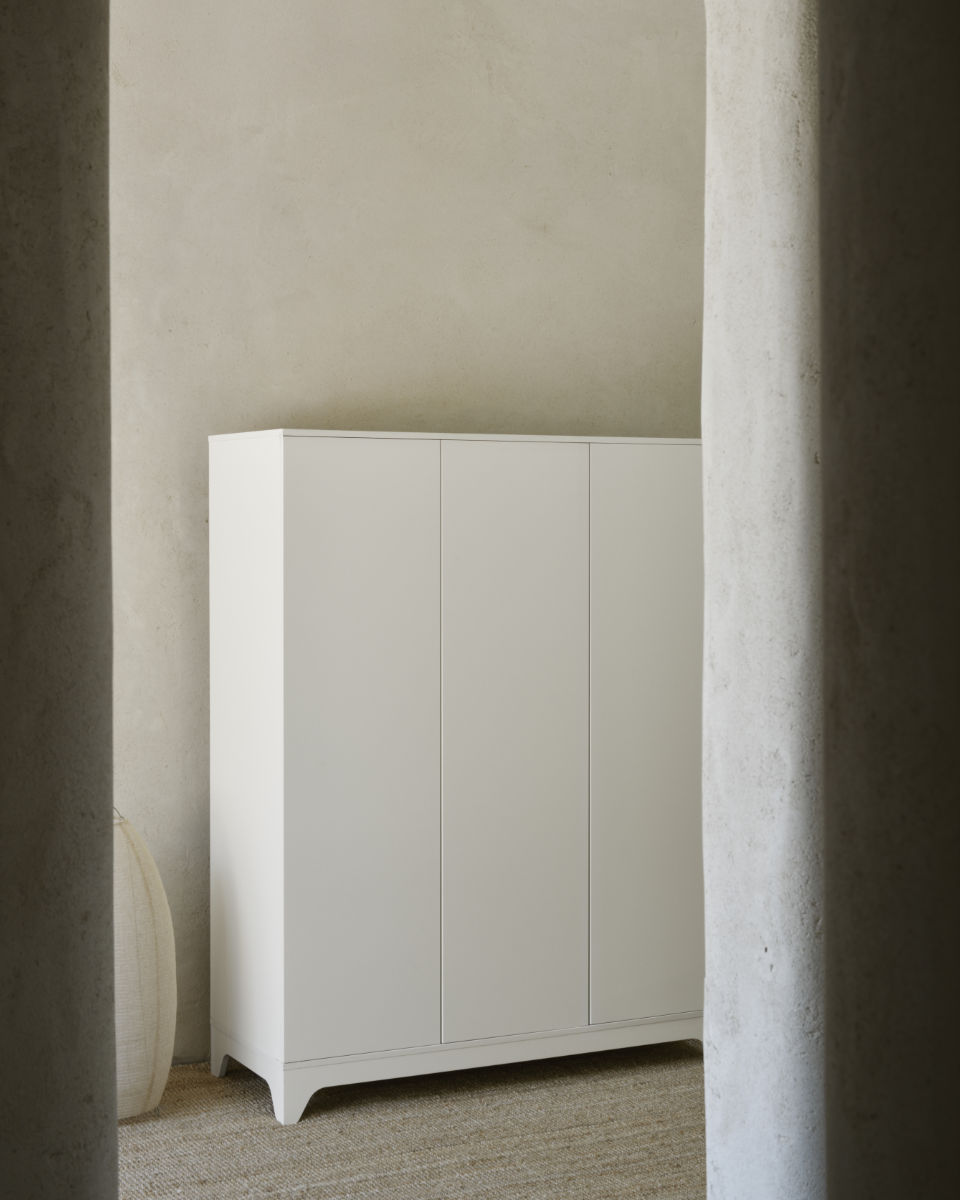 The Tsugi wardrobe is available in two versions: 2-door and 3-door. Both models feature doors with concealed handles and a smooth push-to-open system that enhances the clean, serene appearance.