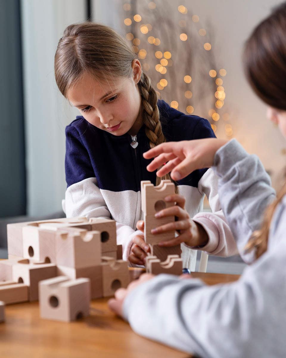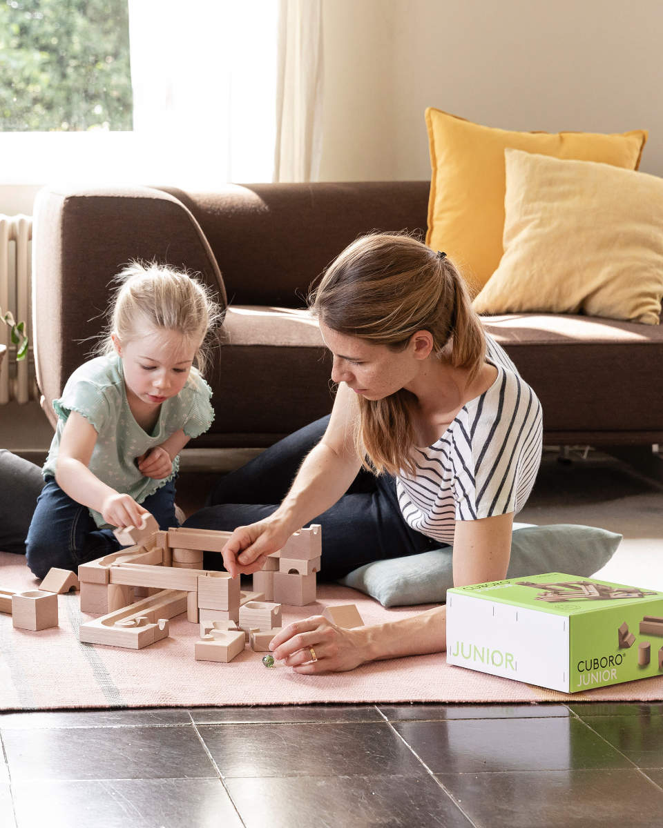The JUNIOR set works beautifully for independent play, but it is also ideal for building together. Many parents discover that marble runs naturally create quality family moments – experimenting, laughing and problem-solving together.