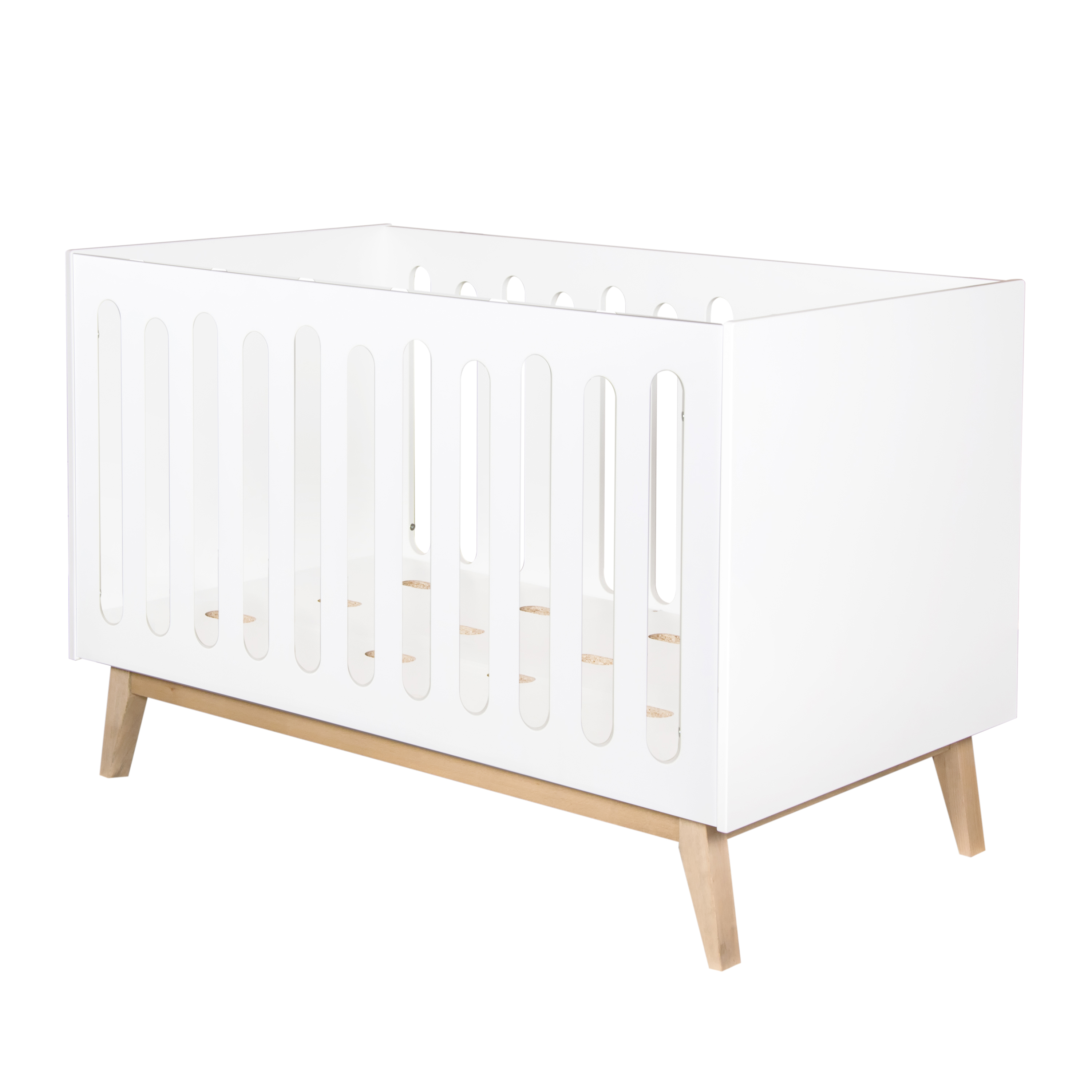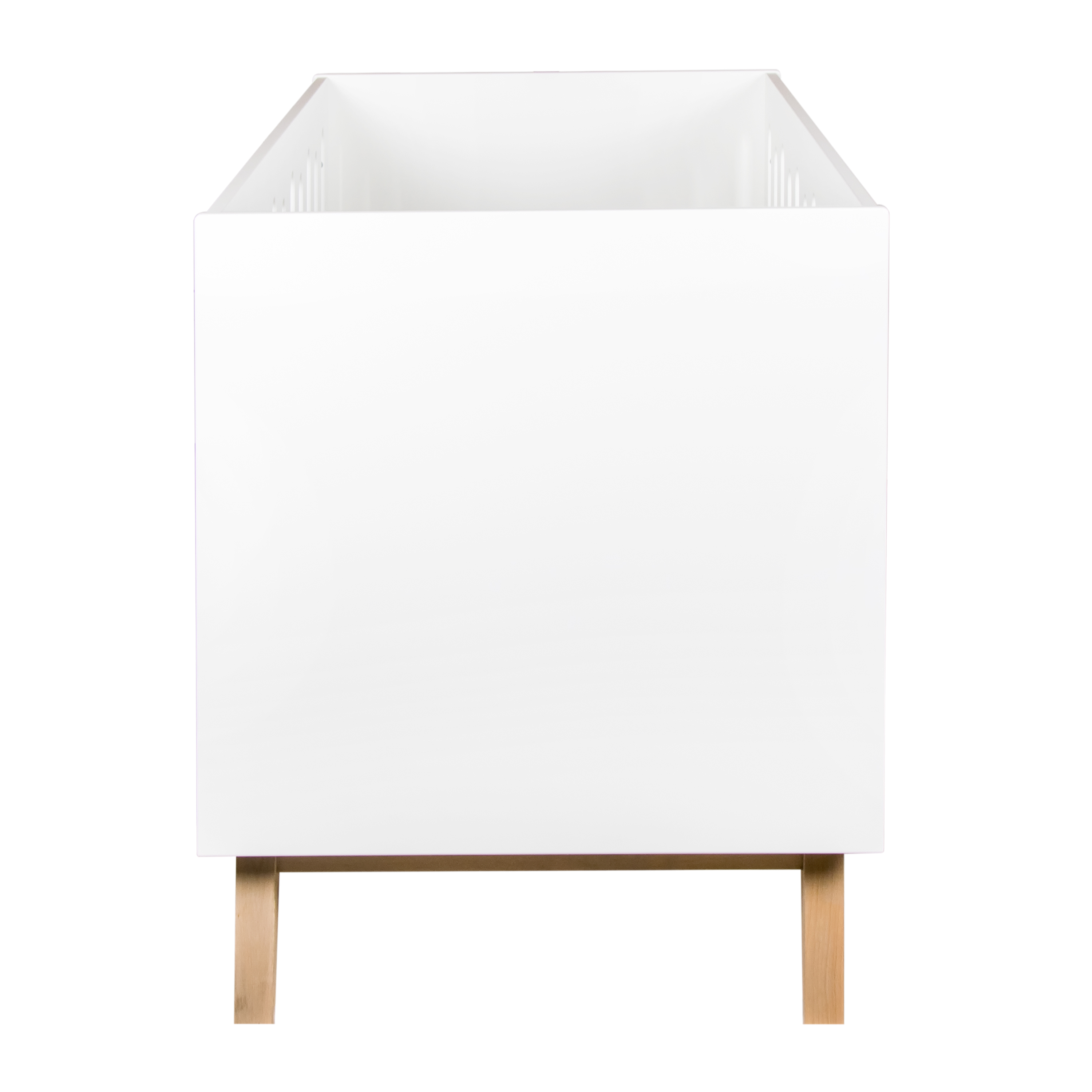 The sides are milled from a plate. This provides additional stability. The bed is height adjustable. An optional conversion side is available - which you can order individually at any time - with which you can convert the cot into an open junior bed.