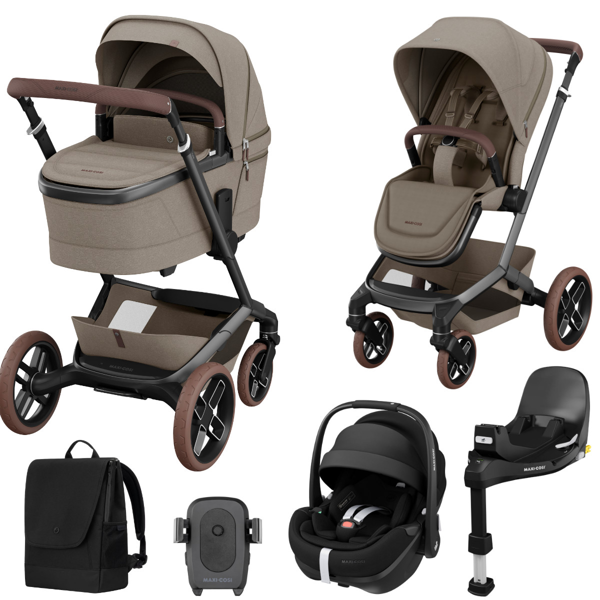 - Maxi Cosi Fame stroller (frame with shopping basket and integrated power bank, reversible seat with bumper bar, carrycot, and carrycot adapters)
