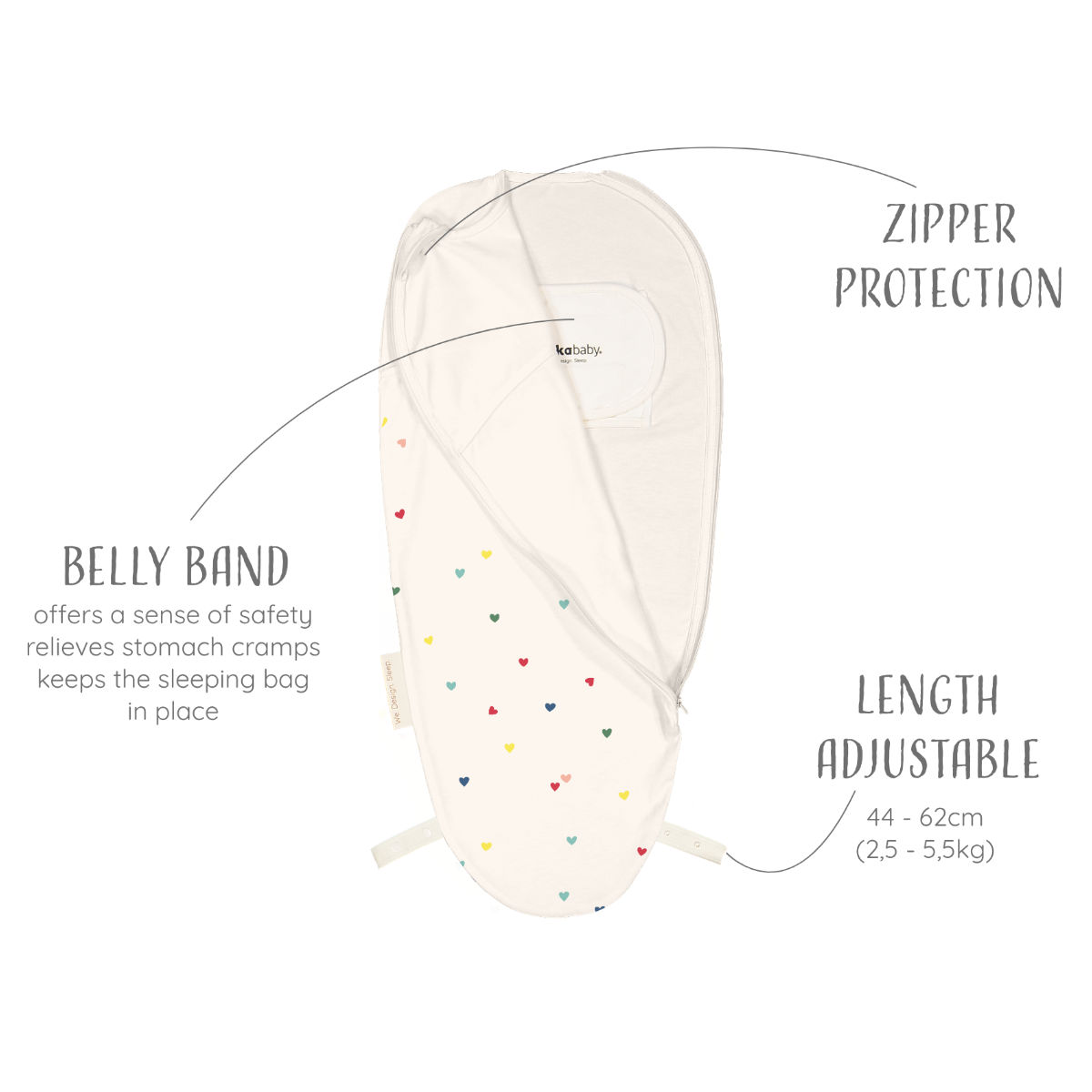 Inside the Piep there is a belly band that holds the baby securely in place. This prevents the baby from sliding down. The slight pressure of the belly band also provides additional relief for intestinal cramps. The arms lie loosely over the belly band, but remain inside the bag. The zipper on the side is closed and by tying the ties at the feet, the sleeping bag is adjusted to fit. So the sleeping bag fits around the baby like a nice and comfortable cocoon