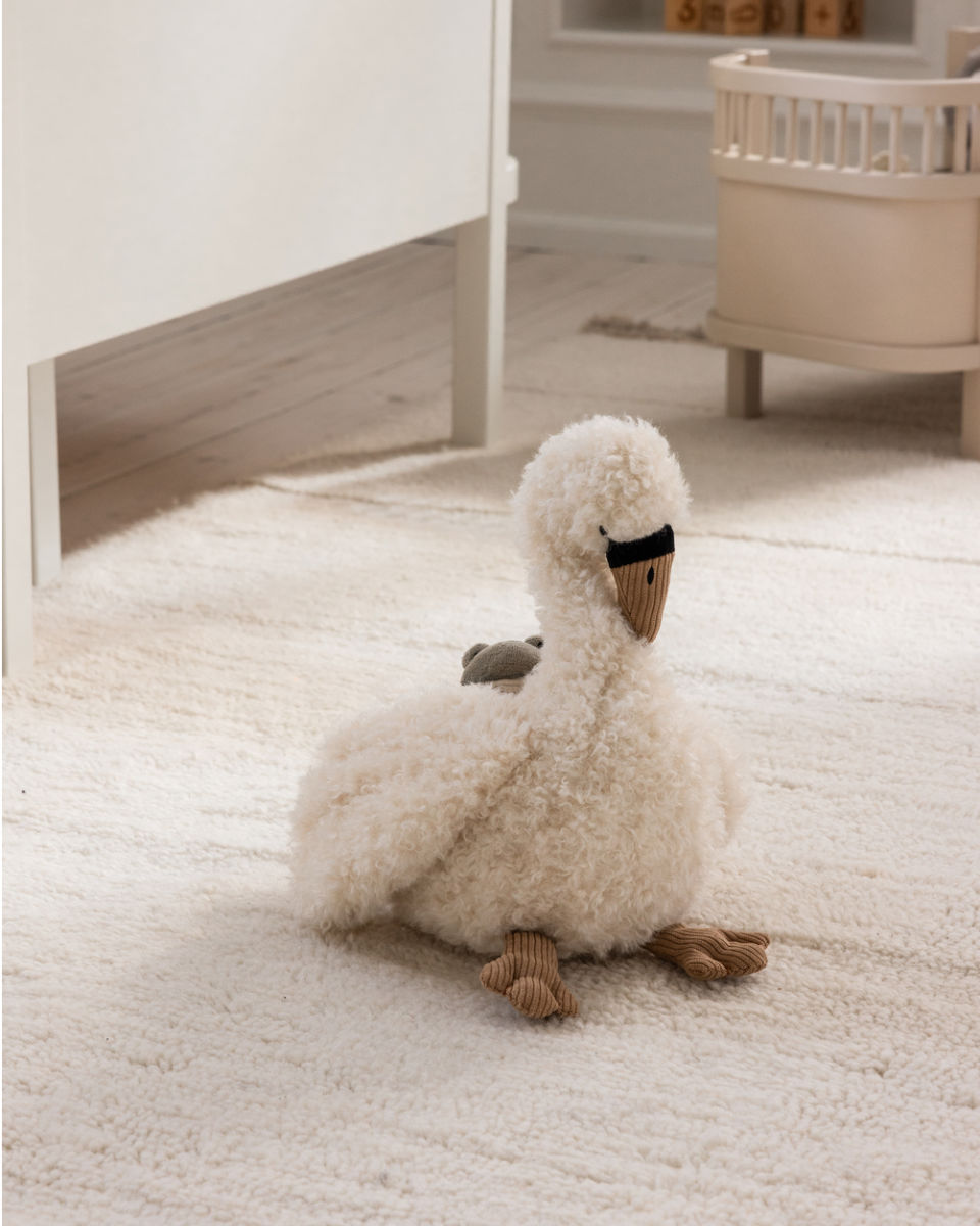 The swan's wings are equipped with Velcro fasteners. This allows you to fix or open them, which trains your child's fine motor skills. Whether as a cozy companion in bed, an exciting toy during the day, or a decorative element on the shelf – this swan adapts to every need. Thanks to the recycled polyester filling, it is also a sustainable choice for eco-conscious parents.