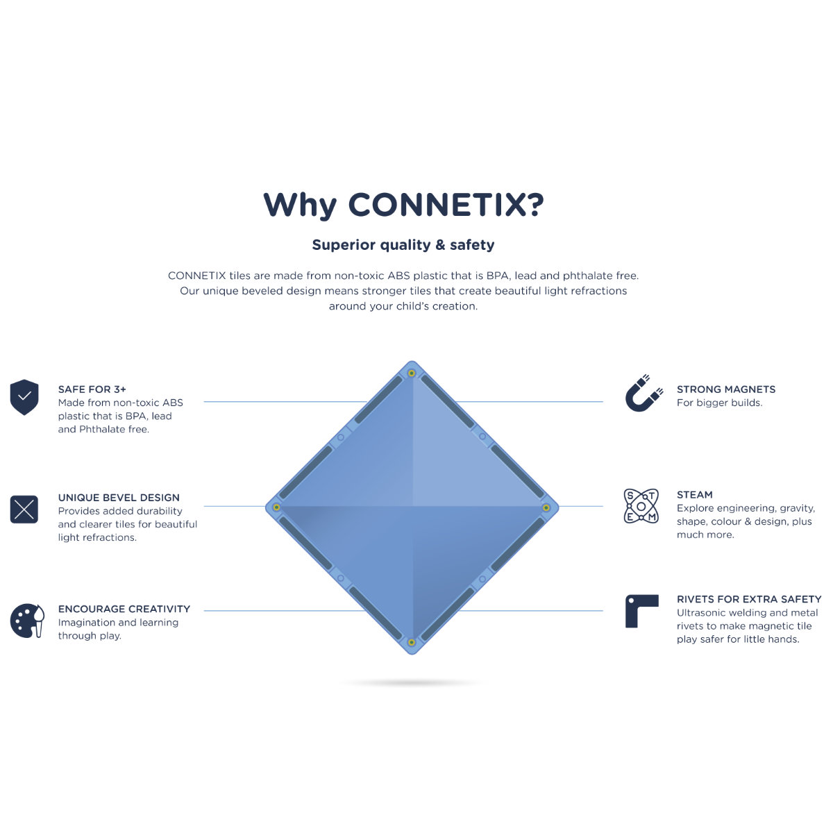 Unlike many other magnetic toys, the inventors of Connetix magnetic toys set the highest standards for the safety and sustainability of their toys from the start. The Australian manufacturer's goal was to produce a quality toy that children would enjoy for many years and that would not break after just a few months of use. That's why all of the magnetic plates in the Connetix Magnet Sets are sealed and riveted for maximum safety.