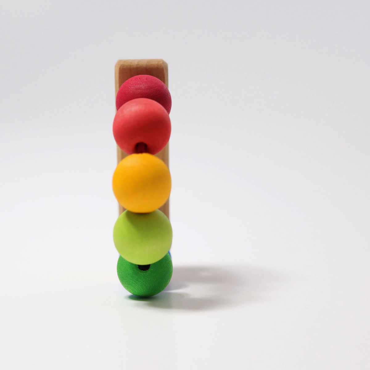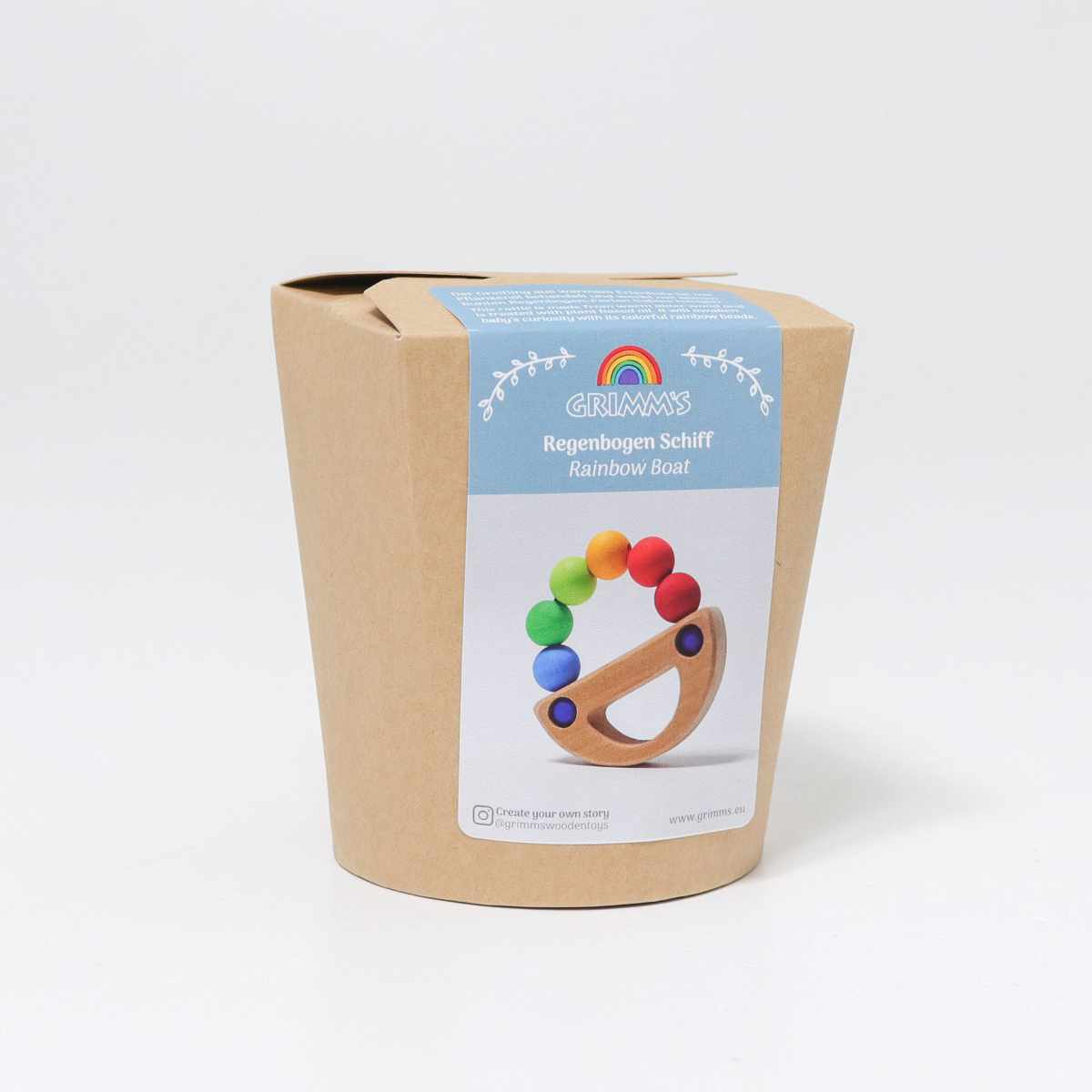 The Grimm's Rainbow Ship Grip Toy, adorned with colorful beads, invites little ones to grasp and explore. Crafted from high-quality woods, this grip toy provides a safe and stimulating environment for babies.