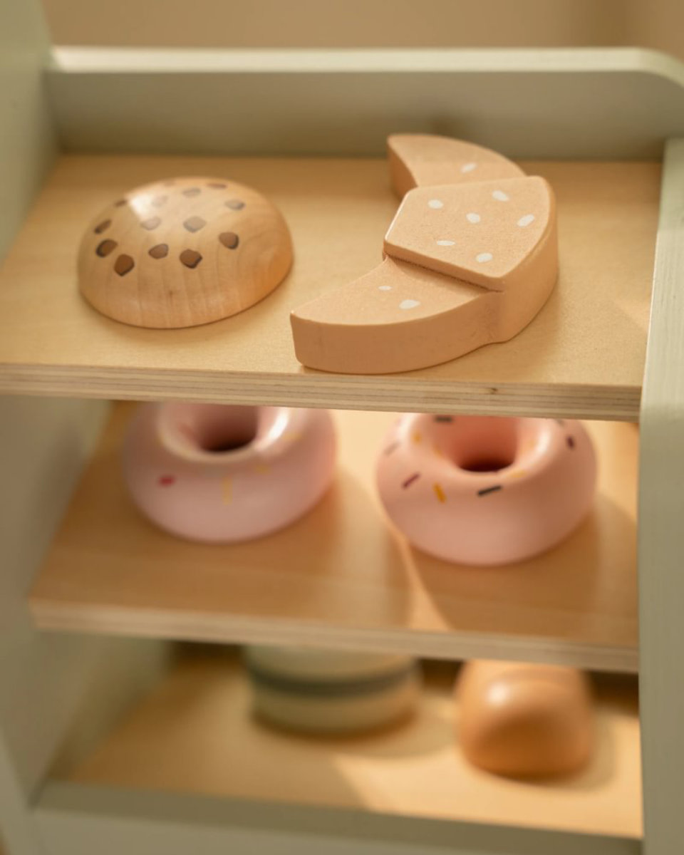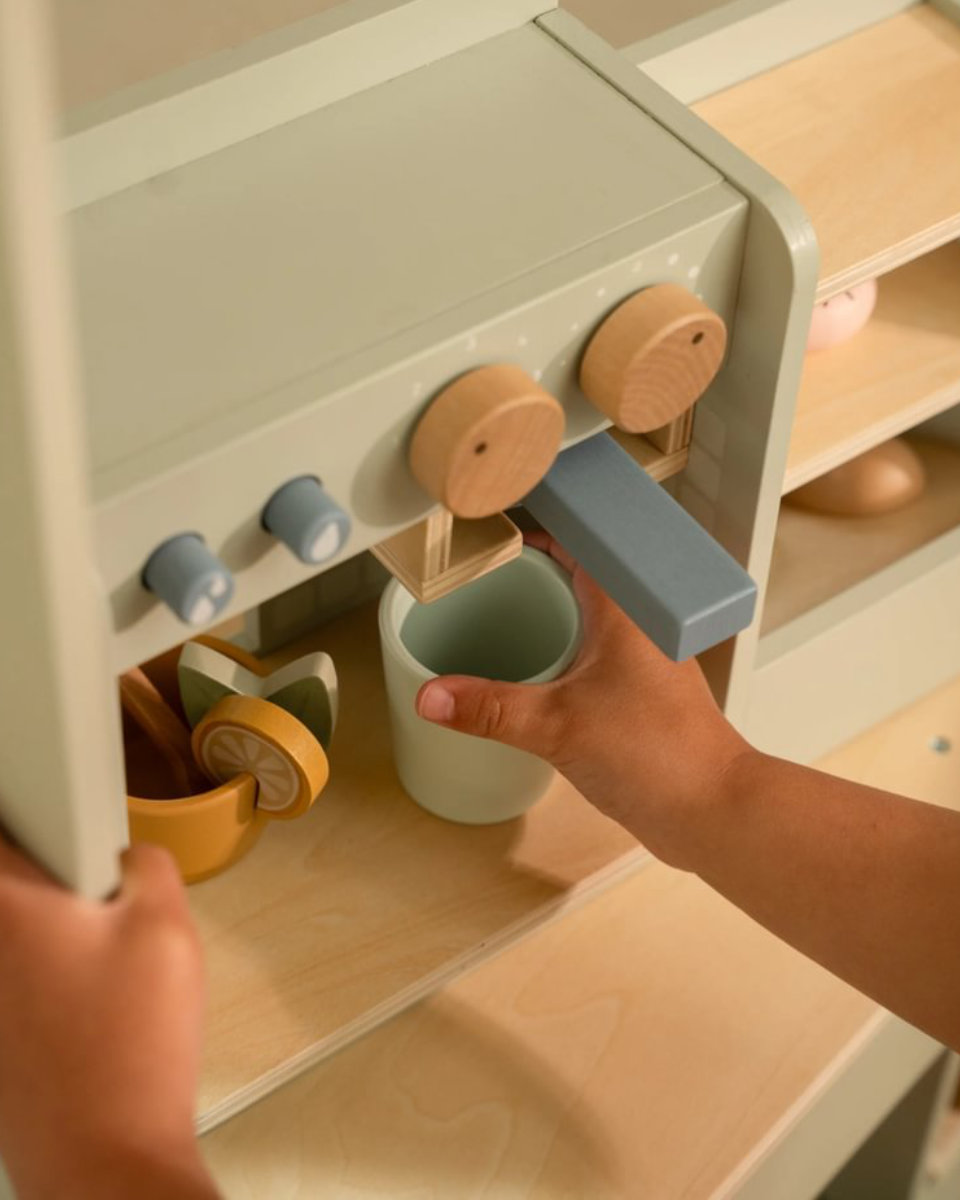 The Coffee Corner includes a coffee machine and a tea machine, various buttons and settings, as well as space for coffee capsules. Thanks to the practical storage, cups and accessories can be neatly stored. In the small cabinet, children can present pastries and sandwiches – just like in a real café.