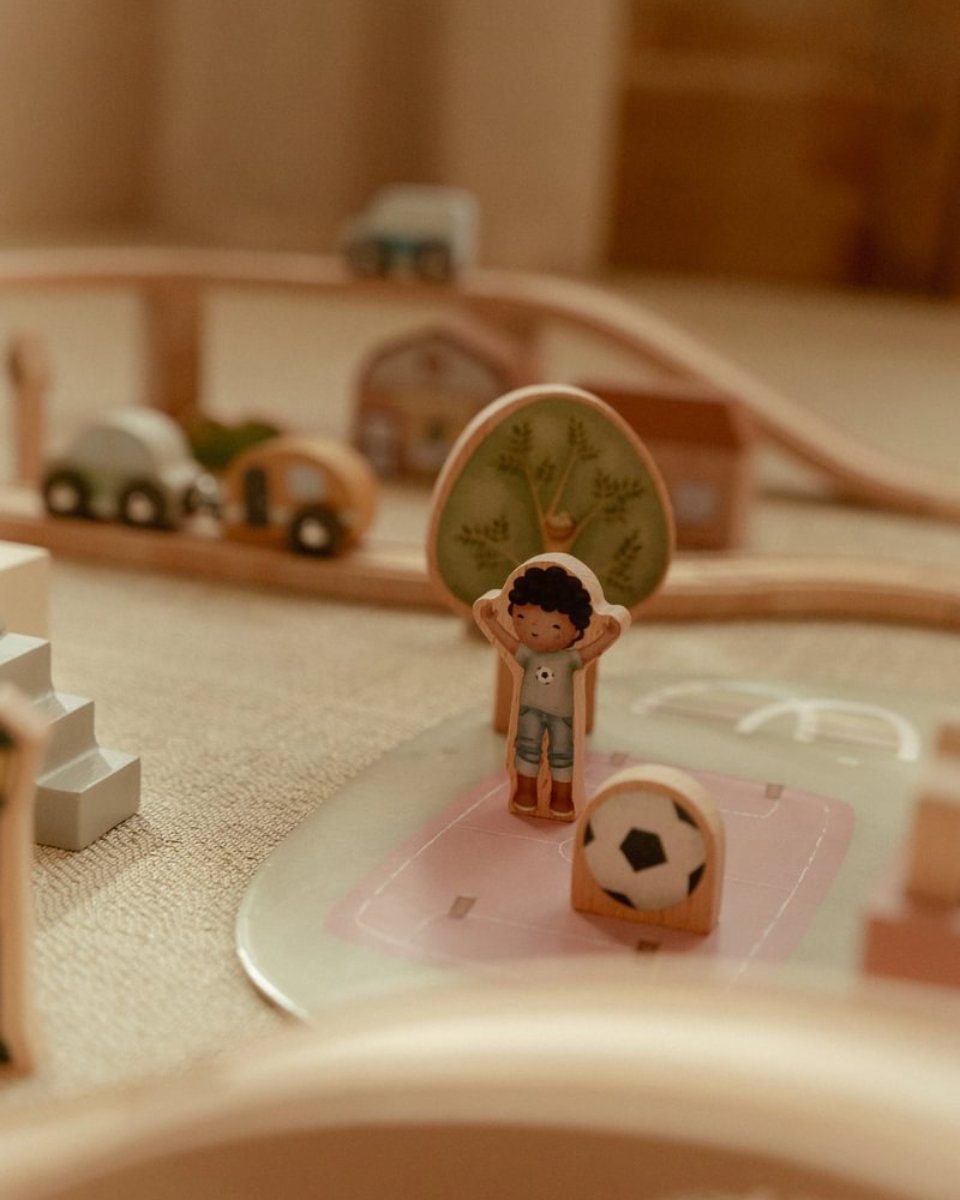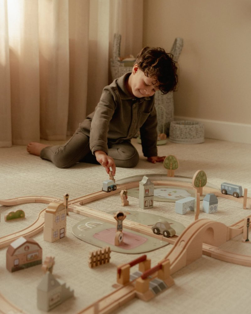 With the Little Dutch Wooden Train Set XL, you can build your very own little world! This beautifully designed set made from FSC™-certified wood offers endless possibilities for building, driving, and exploring – perfect for creative kids who love imaginative play.