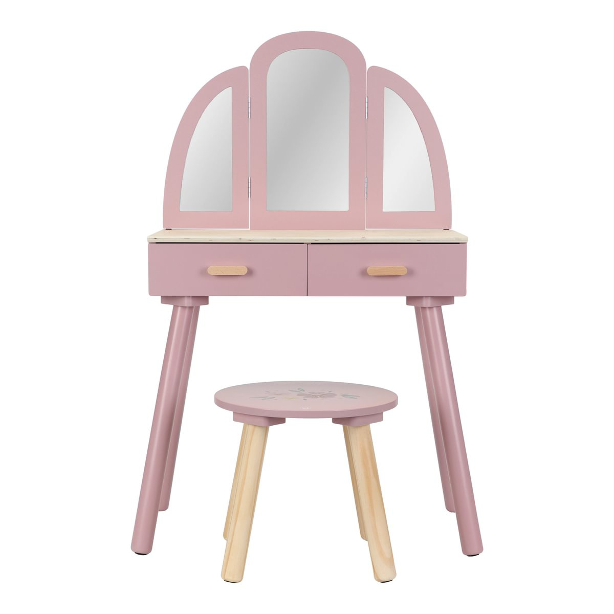 The delicate pink dressing table features a three-part mirror that lets your child admire themselves from every angle. The spacious drawers provide room for little treasures, while the matching stool with flower illustration and the six wooden beauty accessories complete the set.