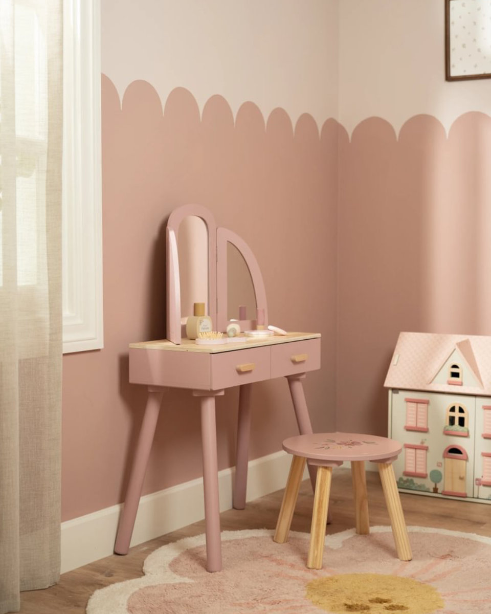 Made from sturdy, FSC-certified wood and painted with child-safe, non-toxic colors, this dressing table ensures both safety and durability. Its elegant design makes it a beautiful addition to any child’s room.