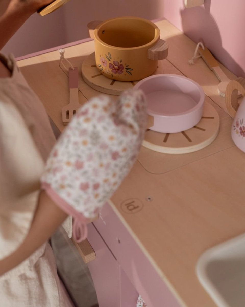 The play kitchen features a sink for washing hands and a cabinet for storing groceries. Salt and pepper shakers add extra flavor, while the curtain, tea towel, and oven mitt in the Soft Flowers design bring a special charm.