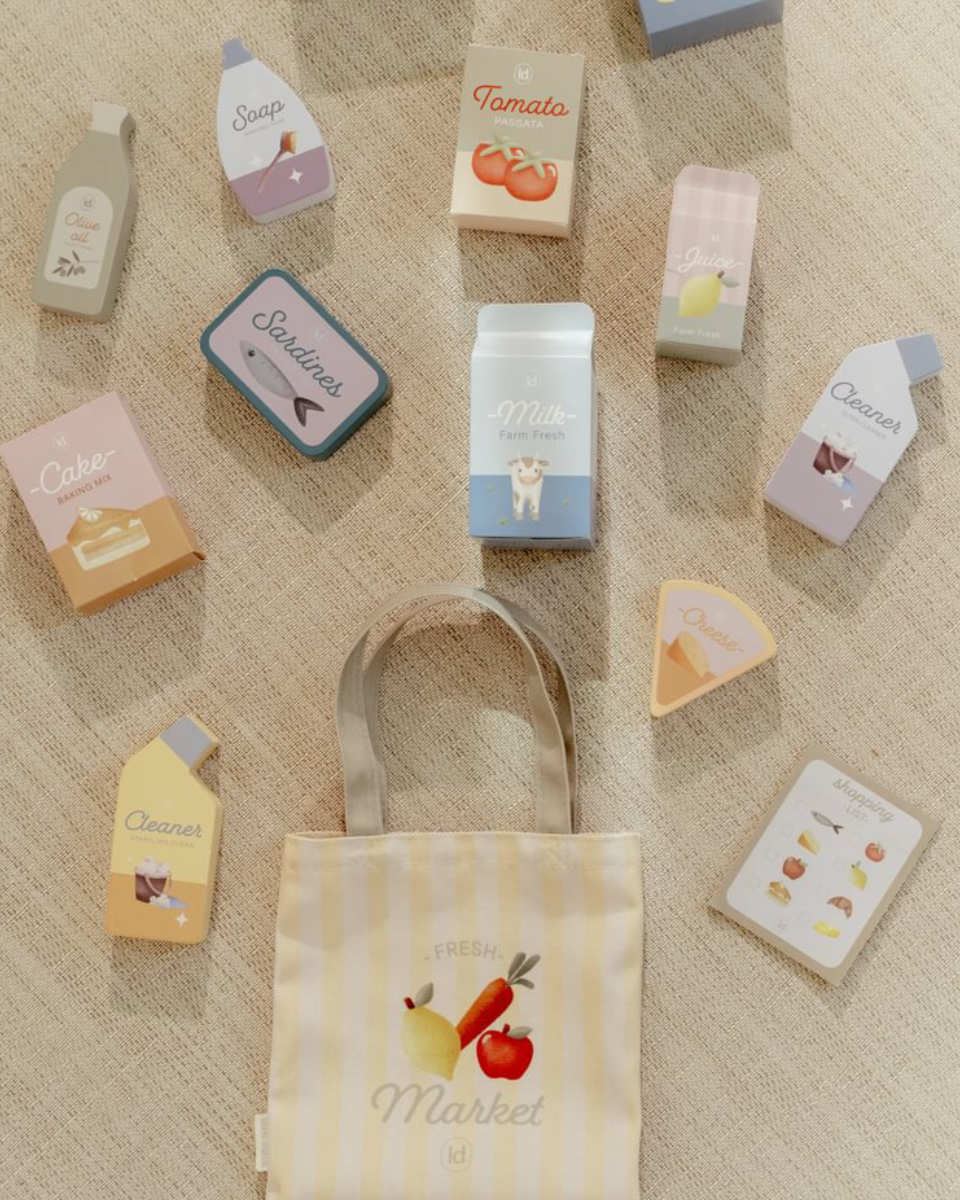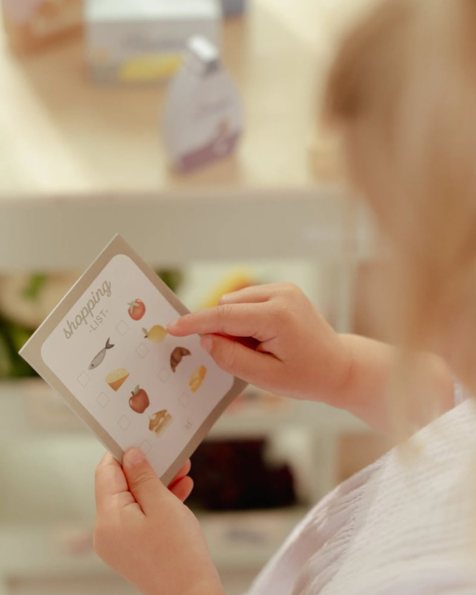 The shopping cart features a large compartment for groceries and a practical wooden clip to hold the shopping list. The set also comes with various grocery items and a fabric bag – so the play can begin right away.