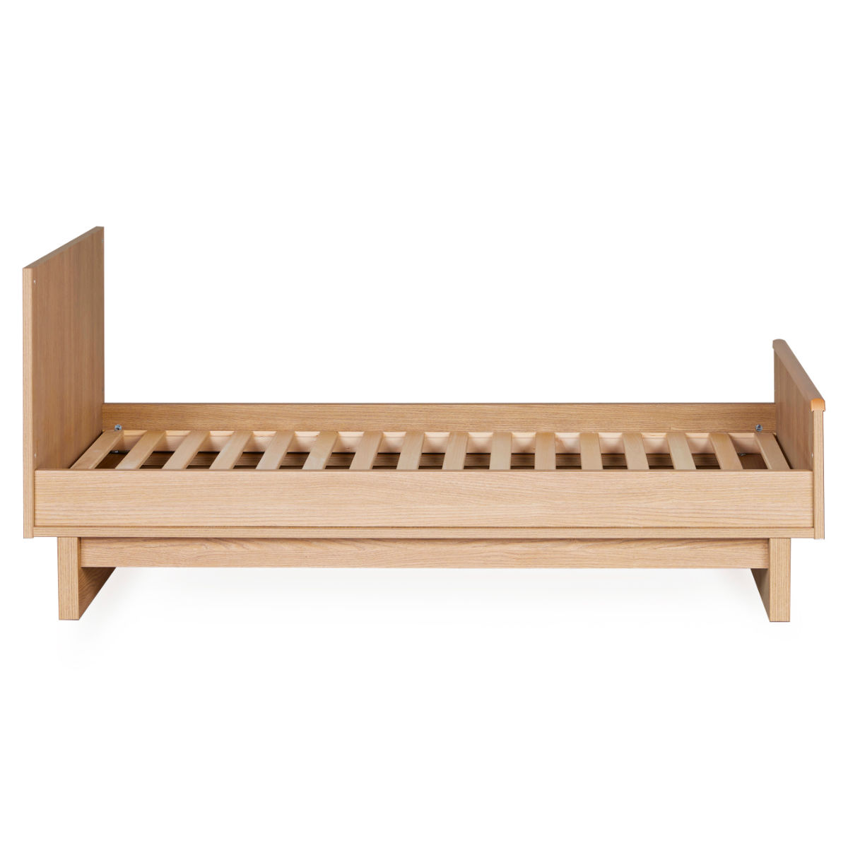 Mit dem optionalen Junior Kit lässt sich das Babybett ganz einfach in ein Juniorbett mit 170 × 70 cm Liegefläche verwandeln. Das Set enthält eine praktische Erweiterung für den Lattenrost sowie einen kleinen Nachttisch – ideal für Kinder bis etwa 10 Jahre. So bleibt das Kyo Bett viele Jahre ein vertrauter Begleiter im Kinderzimmer.