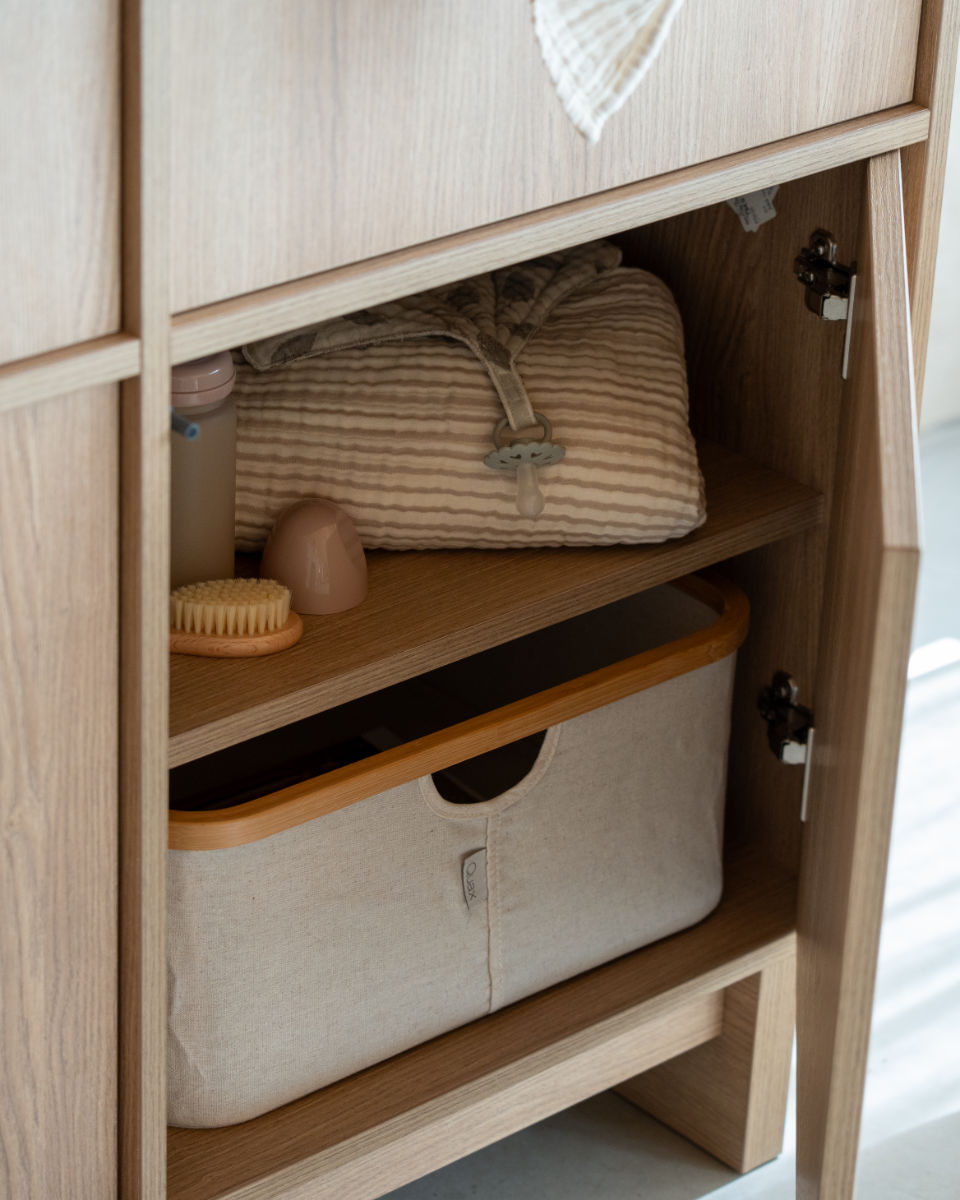 Mit dem Quax Kyo Korb bringst du zusätzliche Struktur und Ruhe in dein Kinderzimmer. Der Korb wurde perfekt auf die Maße der Kyo Kommode und des Kyo Kleiderschranks abgestimmt und ergänzt deren warmes, minimalistisches Design. Ideal, um kleine Dinge ordentlich zu verstauen – ganz ohne Chaos.