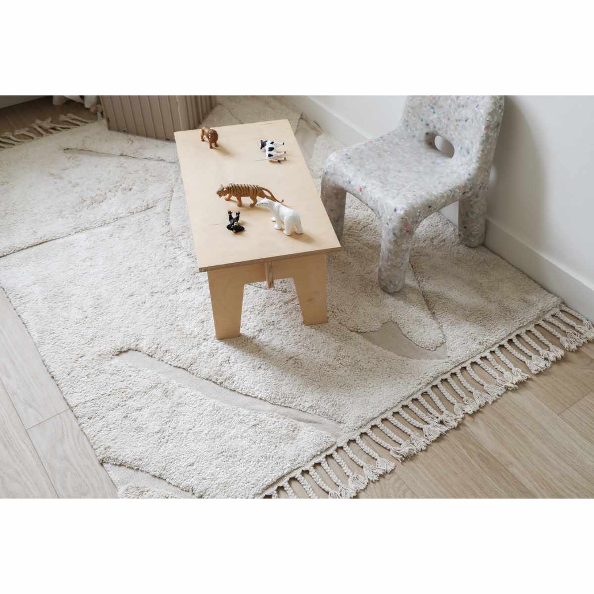 Kleine Flusen können zu Beginn auftreten, dies sind Fasern aus dem Herstellungsprozess. Schüttle den Teppich gut aus, bevor du ihn benutzt. Mit der rutschfesten Unterlage bleibt er an Ort und Stelle, aber wir empfehlen eine zusätzliche rutschfeste Oberfläche.