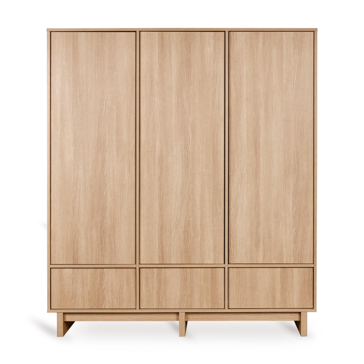 Wenn du besonders viel Platz brauchst, ist der 3-türige Kyo Schrank ideal. Mit sechs verstellbaren Regalböden, zwei Kleiderstangen und drei großen Schubladen bietet er ausreichend Raum für Kleidung, Bettwäsche und Alltagsutensilien. Perfekt für Familien, die Wert auf Ordnung und Übersicht legen.