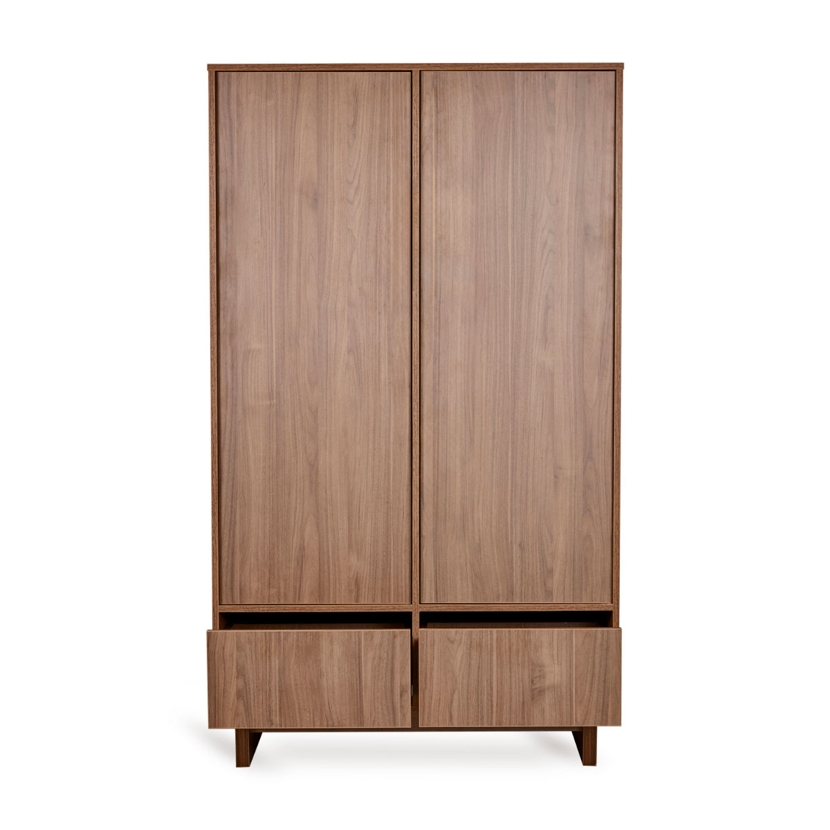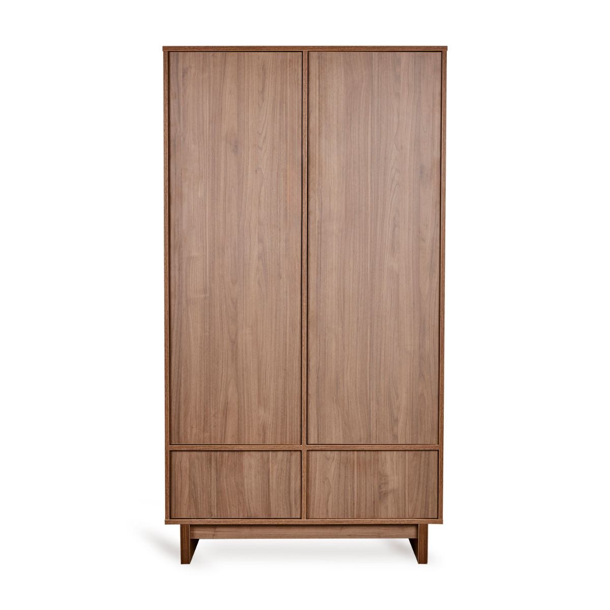 Der 2-türige Kyo Schrank bietet dir eine durchdachte Aufteilung: Hinter den Türen befinden sich drei verstellbare Regalböden und zwei Kleiderstangen. Unten sorgen zwei geräumige Schubladen für zusätzlichen Platz. Das Design mit unsichtbaren Griffen und Push-to-Open-System sorgt für eine ruhige Optik.
