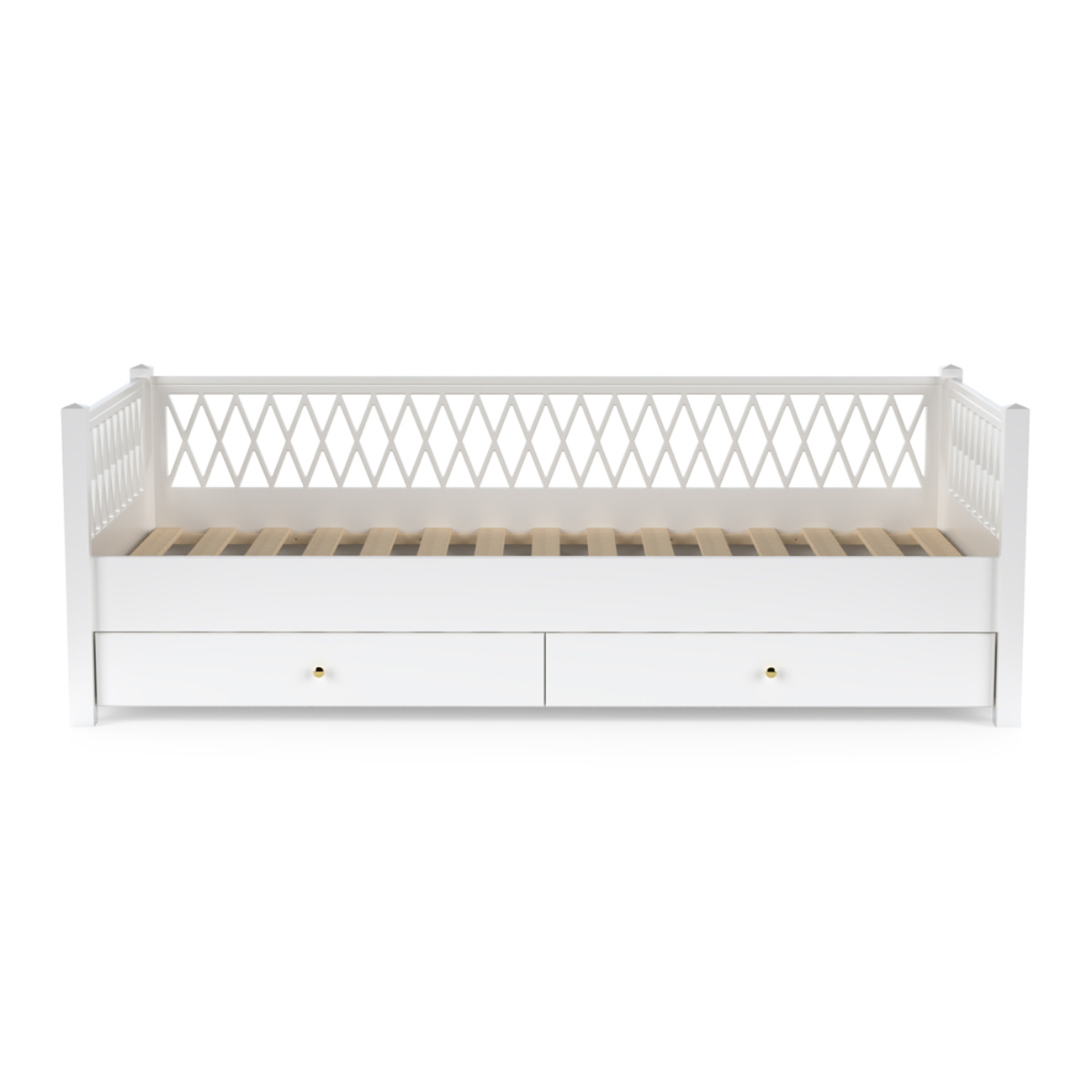 Das Harlequin Tagesbett verfügt bereits über die notwendigen vorgebohrten Löcher, um die Befestigung des Schubladenmoduls so einfach wie möglich zu gestalten.
