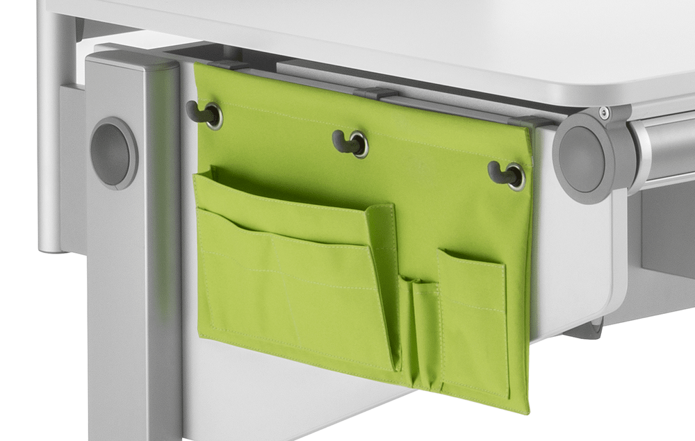 Über die patentierten Haken wird das Utensilo einfach rechts oder links an die Tischseite gehängt. Die vielfältigen Unterteilungen machen es möglich, unterschiedlichste Gegenstände zu deponieren. Die Haken passen für alle aktuellen moll Tischmodelle. Das in sieben trendigen und frischen Farben erhältliche Utensilo beside ist aus strapazierfähigen Polyester.