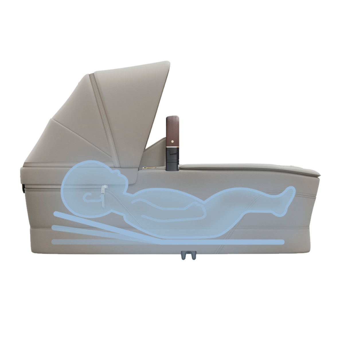 - Übergang: Wenn die Wanne zu klein wird (ca. ab 6 Monaten oder 9 kg), wechselst du auf den Fame Cabin Sitz – zunächst in flacher Liegeposition, bis dein Kind eigenständig sitzen kann.