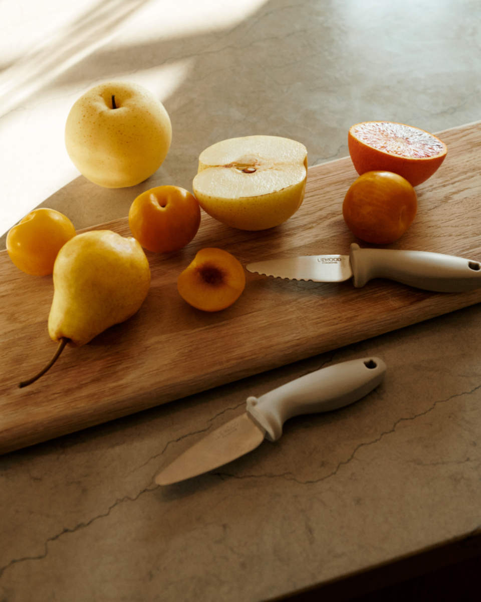 Das Liewood Perry Messerset ist speziell für Kinder entwickelt, um ihnen die Freude am Kochen nahezubringen und ihre Beteiligung an der Zubereitung von Mahlzeiten zu fördern. Dieses Set beinhaltet zwei sichere Messer aus hochwertigem Edelstahl mit Griffen aus 100% Silikon.