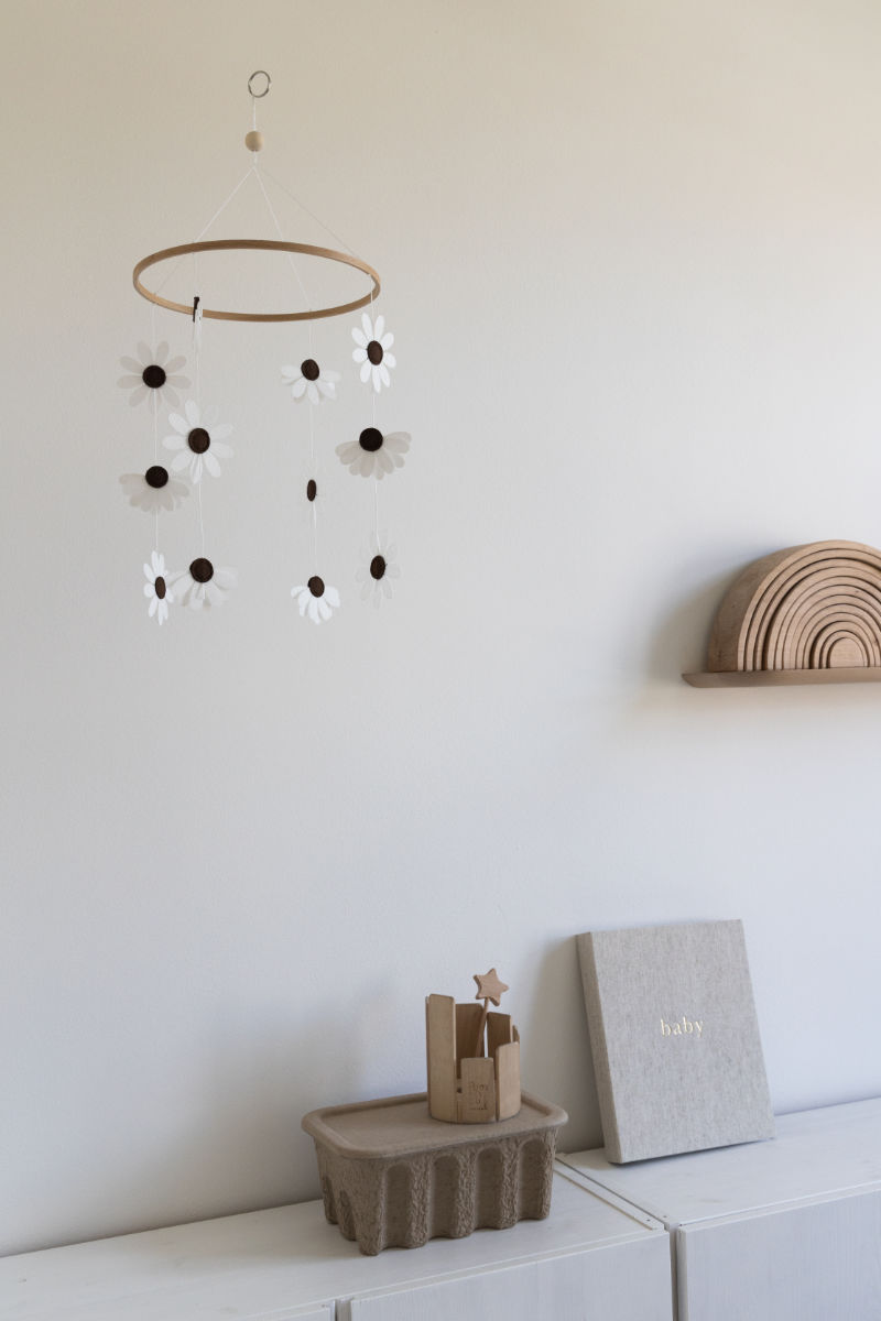 Dieses Mobile dient nur zur Dekoration und sollte außerhalb der Reichweite von Kindern aufgehängt werden. Materialien: Filz und FSC-zertifiziertes Buchenholz.