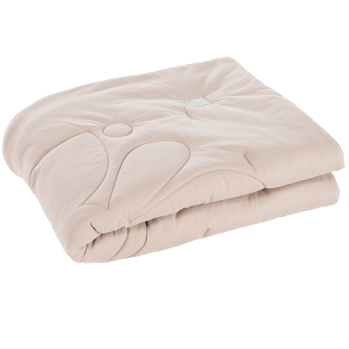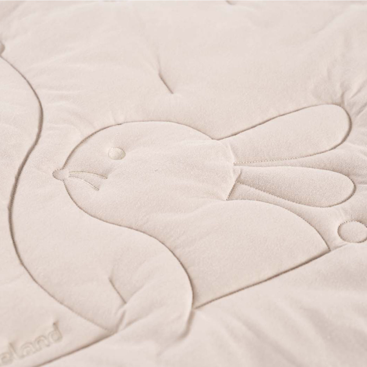 Beim Spielen auf dem Boden ist ein gutes Hautklima entscheidend. Die Oberseite besteht aus einer hochwertigen Mischung aus 95 % Baumwolle und 5 % Elasthan. Während die Baumwolle für maximale Atmungsaktivität und Strapazierfähigkeit sorgt, verleiht das Elasthan der Decke eine angenehme Elastizität. Das bedeutet: Die Decke schmiegt sich an, bleibt aber formstabil, auch wenn dein Baby fleißig das Rollen und Robben übt.