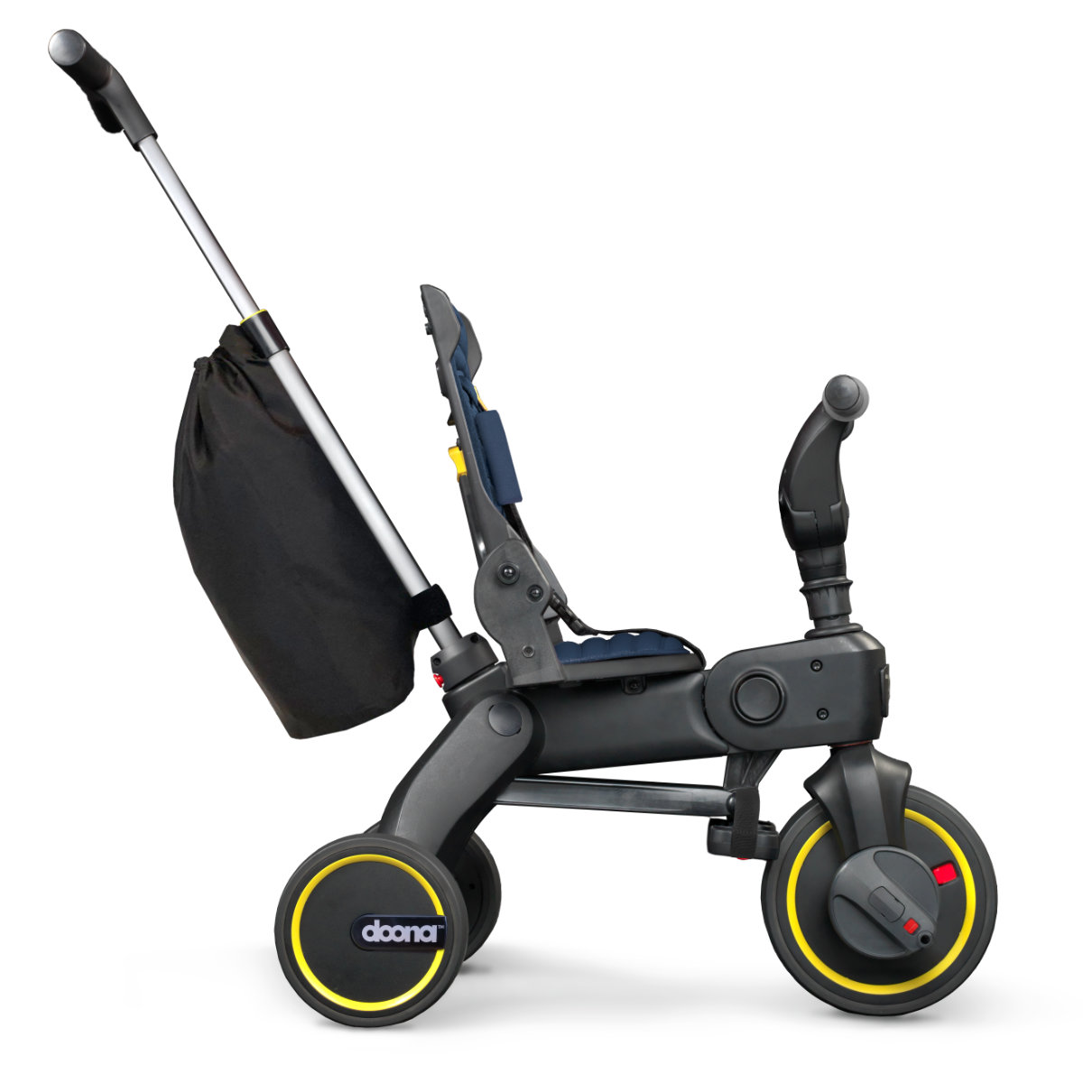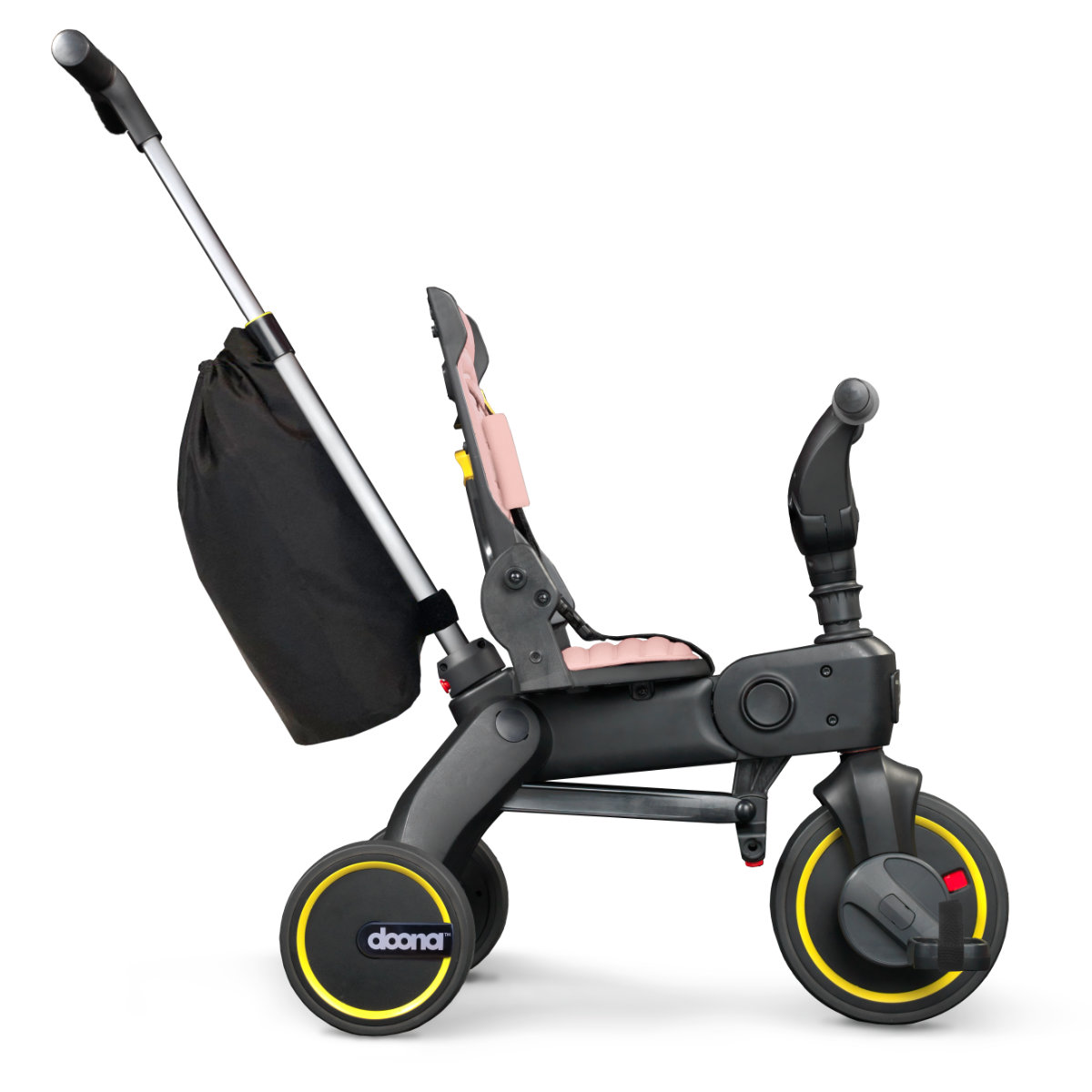 - Phase 4 (Fahrradmodus): ab ca. 30 Monaten – Nutzung wie in Phase 3, das Kind lenkt alleine, mit niedriger Rückenlehne und ohne Schiebestange