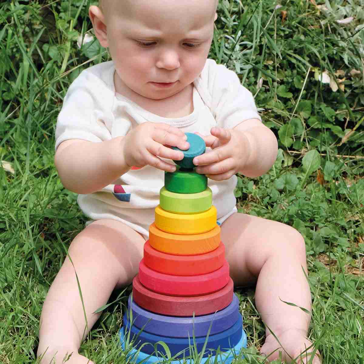 Mit dem großen Scheibenturm von Grimms können Kinder spielerisch Farben und Größen erkunden. Das Stapeln und Bauen mit diesem Turm schult die motorischen Fähigkeiten und bietet kreativen Bau- und Spielspaß.