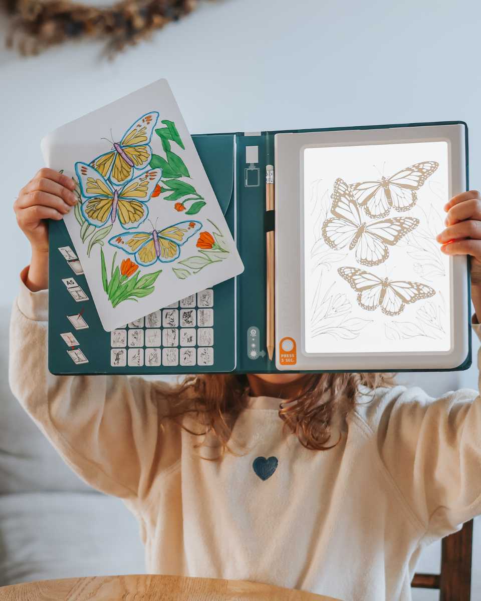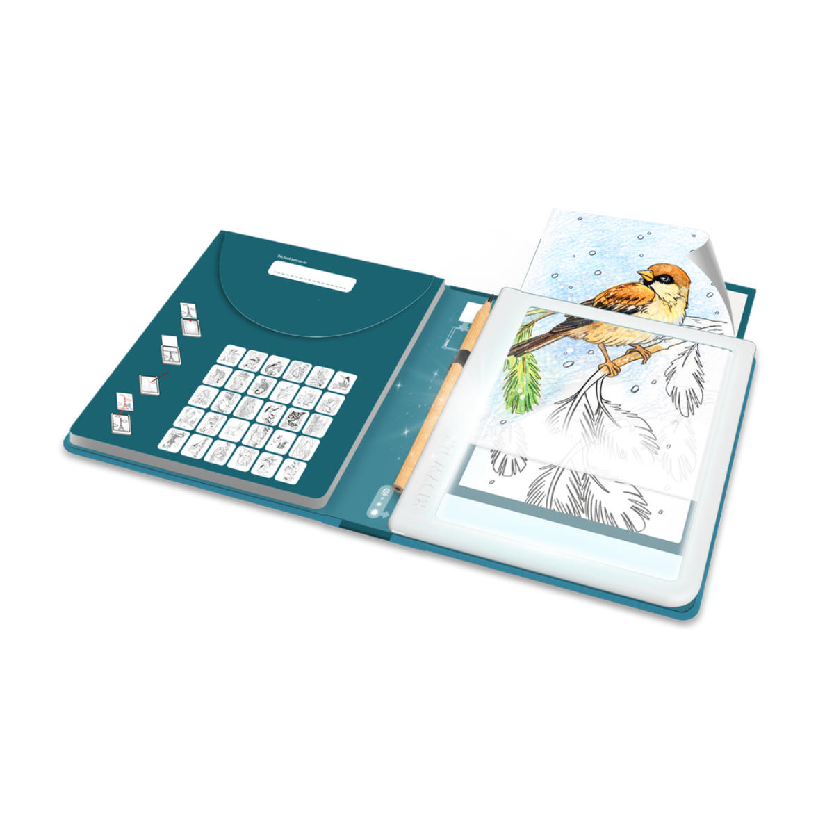 Das Kidydraw ist nicht einfach nur ein Tablett. Es ist in ein praktisches Booklet integriert, in dem das magnetische, abnehmbare Leuchttablett sicher hält. Jede Version des Zeichentischs enthält 30 verschiedene Zeichnungen, die speziell auf eine Altersgruppe abgestimmt sind. Je nach gewählter Variante (6+, 8+ oder 10+) passt sich der Zeichentisch optimal an die Fähigkeiten deines Kindes an.